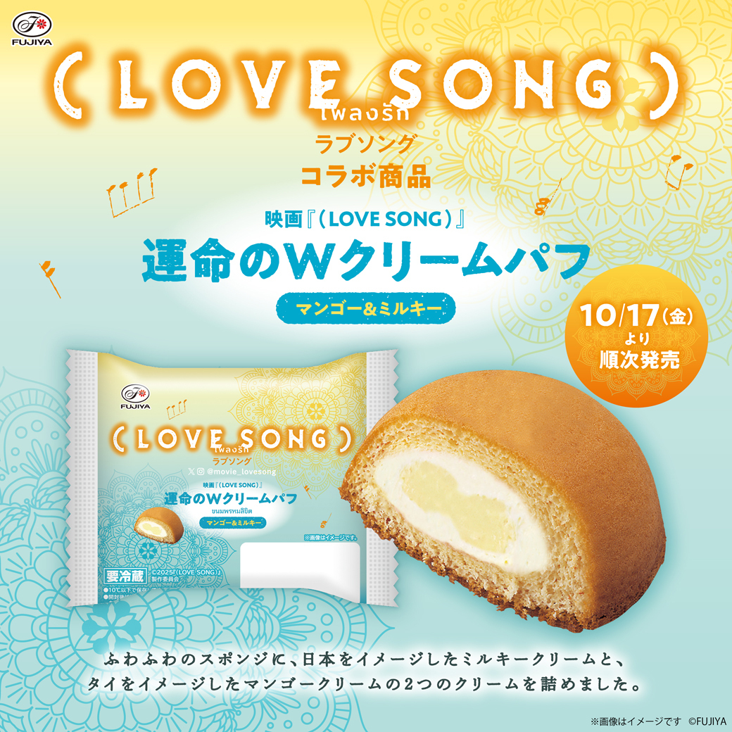 本作の公開を記念して、株式会社不二家より、映画の世界観をイメージしたコラボレーションスイーツ「映画『(LOVE SONG)』運命のWクリームパフ(マンゴー&ミルキー)」が発売!